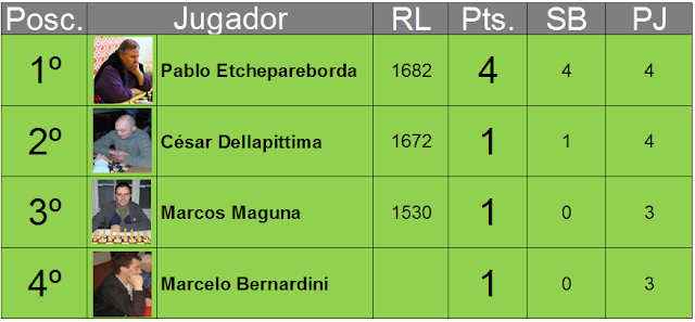 El ganador sumó 5 puntos seguido de Pablo Etchepareborda con 4 pts, quedando tercero Marcos Maguna con 3pts., cuarto Miguel Amadío con 2 pts. y quinto Marcelo Bernardini con 1 pt.